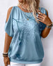 SPECIFICATIONS Top Type: T-shirt Style: Casual Material: Cotton Blends Occasion: Daily Neckline: Round Neck Pattern Type: Feather Sleeve Type: Cold Shoulder Sleeve Length: Short Sleeve Fit Type: Regular Season: Spring,Summer Details: Cut Out Package Includes: 1 x T-shirt SIZE TABLE Size Bust Length CM INCH CM INCH S 97 38.19 65 ...