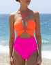 SPECIFICATIONS Style: Sexy Material: 15% Spandex,85% Polyester Occasion: Vacation Neckline: Halter Pattern Type: Color Block Sleeve Length: Sleeveless Top Type: One Piece Bra Type: Wireless Bra Fit Type: Skinny Season: Spring,Summer,Fall,Winter Details: Bandage Package Includes: 1 x One Piece SIZE TABLE Size Bust Waist Hip Under bust CM IN...