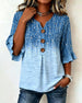 SPECIFICATIONS Top Type: Blouses Style: Casual Material: Cotton Blends Occasion: Daily Neckline: V neck_V Pattern Type: Striped Sleeve Type: Ruffle Sleeve Sleeve Length: 3/4 Sleeve Fit Type: Regular Season: Spring,Summer Details: Buttons,Shirred Package Includes: 1 x Blouse SIZE TABLE Size Bust Length CM INCH CM INCH S 97 38.19 65...