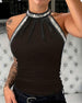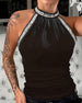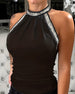 SPECIFICATIONS Top Type: Knit Tops Style: Chic Material: Cotton Blends,Sequins Occasion: Daily,Party Neckline: Halter Pattern Type: Solid Color Sleeve Length: Sleeveless Fit Type: Regular Season: Fall,Winter Details: Patchwork Package Includes: 1 x Knit Top SIZE TABLE Size Bust Length CM INCH CM INCH S 92 36.22 65 25.59 M 96 37.8 66...