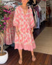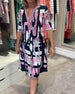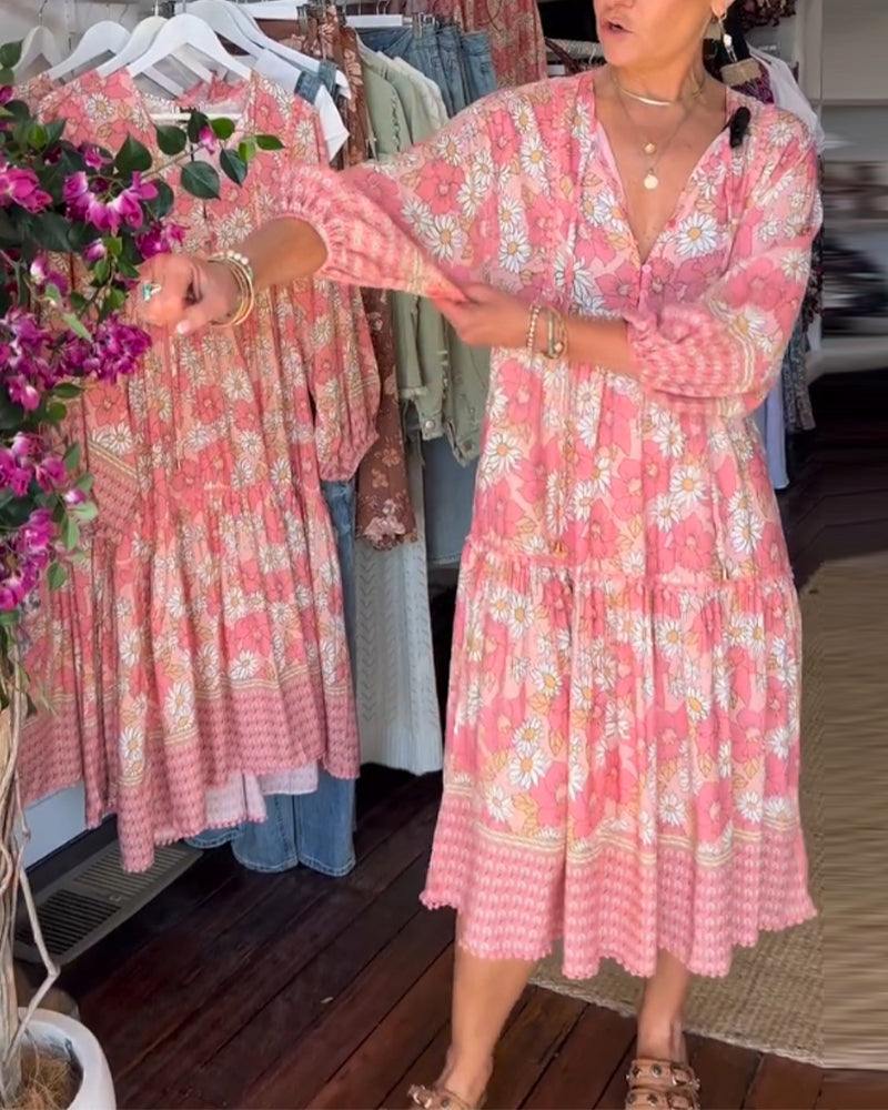 SPECIFICATIONS Style: Casual, Vacation Material: Cotton Blends Dress Type: A-Line Dress Length: Midi Neckline: V neck_V Pattern Type: Print Sleeve Type: Dropped shoulder Sleeve Length: 3/4 Sleeve Fit Type: Regular Season: Spring, Summer Occasion: Daily, Vacation Package Includes: 1 x Dress SIZE TABLE Size Bust Length CM INCH C...
