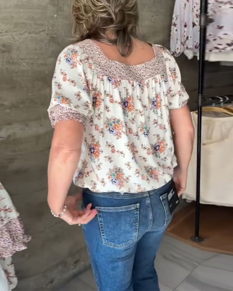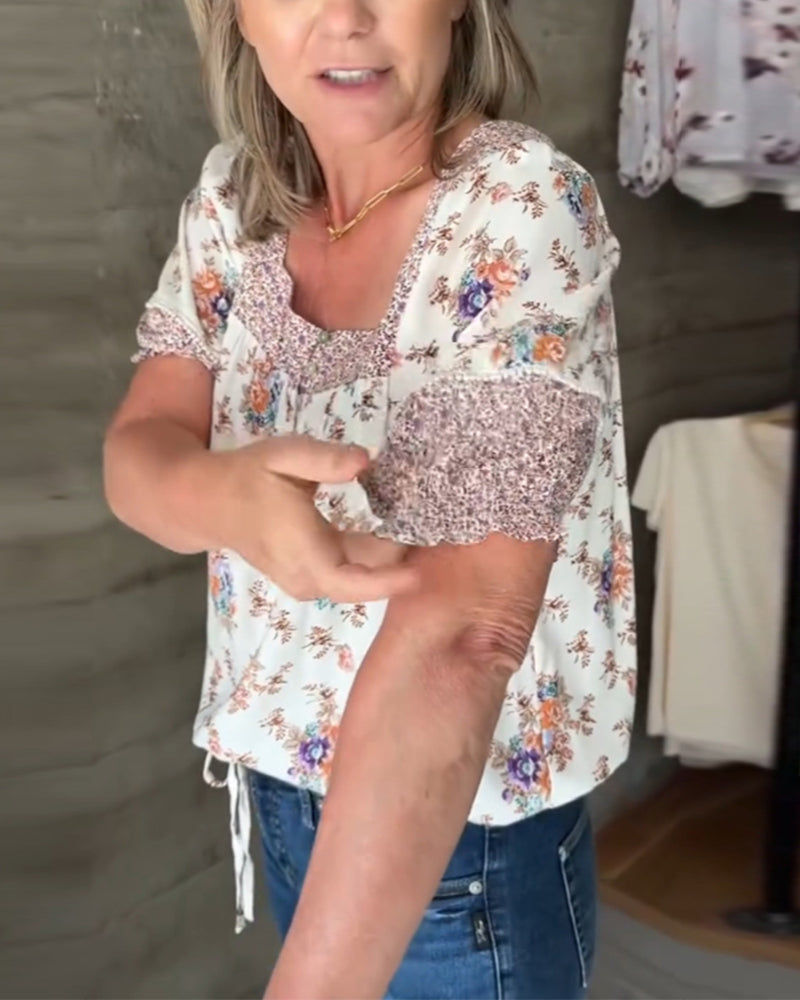 SPECIFICATIONS Top Type: Tops Style: Casual Material: Cotton Blends Occasion: Daily, Vacation Neckline: Square Neck Pattern Type: Floral Sleeve Type: Lantern Sleeve Sleeve Length: Short Sleeve Fit Type: Regular Season: Summer Details: Drawstring, Knot Package Includes: 1 x Top SIZE TABLE Size Bust Length CM INCH CM INCH S 95...