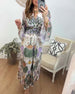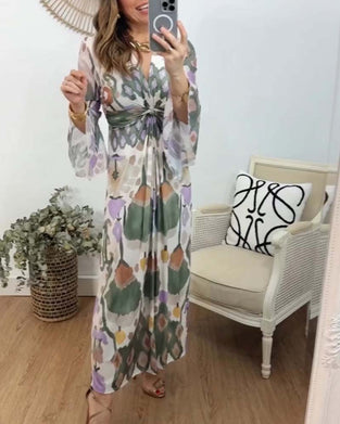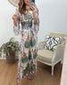 SPECIFICATIONS Style: Elegant Material: Cotton Blends Dress Type: A-Line Dress Length: Maxi Neckline: V neck_V Pattern Type: Print Sleeve Type: Flare Sleeve Sleeve Length: Long Sleeve Details: Shirred Fit Type: Regular Season: Spring, Summer Occasion: Daily, Vacation Package Includes: 1 x Dress SIZE TABLE Size Bust Length CM I...