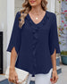 SPECIFICATIONS Top Type: Blouses Style: Casual Material: Cotton Blends Occasion: Daily Neckline: V neck_V Pattern Type: Solid Color Sleeve Type: Slit Sleeves Sleeve Length: Half Sleeve Fit Type: Regular Season: Spring,Summer Details: Ruffle Package Includes: 1 x Blouse SIZE TABLE Size Bust Length CM INCH CM INCH S 100 39.37 68 2...