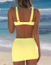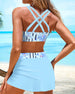 SPECIFICATIONS Style: Vacation Material: 15% Spandex,85% Polyester Pattern Type: Print Sleeve Length: Sleeveless Top Type: Bikini Bra Type: Wireless Bra Bottom Type: Skirts Fit Type: Skinny Details: Backless,Lace Up,Bowknot Package Includes: 1 x Bikini SIZE TABLE Size Bust Waist Hip Under bust CM INCH CM INCH CM INCH CM INCH S 88 34.65 7...
