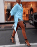 FEATURES Back Zipper: The sleek back zipper adds a modern touch, making it easy to wear and offering a seamless fit. Asymmetrical Design: The irregular, asymmetrical cut provides a chic and contemporary look, setting you apart from the crowd. Turn-down Collar: The classic turn-down collar adds a timeless elegance, suitable for both casual an...