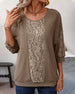 SPECIFICATIONS Top Type: Blouses Style: Casual, Elegant Material: Cotton Blends, Lace Occasion: Daily Neckline: Round Neck Pattern Type: Solid Color Sleeve Type: Regular sleeve Sleeve Length: 3/4 Sleeve Fit Type: Regular Season: Spring, Summer, Fall Details: Patchwork, Hollow Out, Lace Package Includes: 1 x Blouse SIZE TABLE (cm) ...