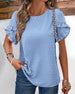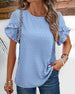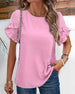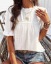 SPECIFICATIONS Top Type: Tops Style: Elegant Material: Cotton, Polyester Occasion: Daily Neckline: Round Neck Pattern Type: Solid Color Sleeve Type: Ruffle Sleeve Sleeve Length: Short Sleeve Fit Type: Regular Season: Spring, Summer, Fall Details: Patchwork Package Includes: 1 x Top SIZE TABLE Size Bust Length Sleeve L...