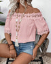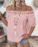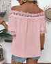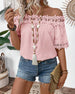 SPECIFICATIONS Top Type: Blouses Style: Casual Material: Cotton Blends Occasion: Daily Neckline: Off Shoulder Pattern Type: Print Sleeve Type: Regular sleeve Sleeve Length: Short Sleeve Fit Type: Regular Season: Spring,Summer Details: Patchwork,Lace Package Includes: 1 x Blouse SIZE TABLE Size Bust Length CM INCH CM INCH S 97 38...