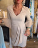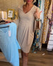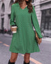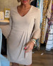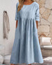 SPECIFICATIONS Style: Elegant Material: Cotton Blends Dress Type: A-Line Dress Length: Knee Length Neckline: V neck_V Pattern Type: Solid Color Sleeve Type: Flare Sleeve Sleeve Length: 3/4 Sleeve Details: Patchwork, Shirred Fit Type: Regular Season: Spring, Summer, Fall Occasion: Daily Package Includes: 1 x Dress SIZE TABLE Size...