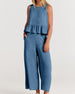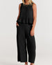 SPECIFICATIONS Top Type: Tops Style: Elegant Material: Cotton Blends Occasion: Daily Neckline: Round Neck Pattern Type: Solid Color Sleeve Length: Sleeveless Pants Length: Long Fit Type: Regular Season: Spring, Summer, Fall Details: Pocket, Ruffle Package Includes: 1 x Top, 1 x Pants SIZE TABLE Size Bust Top length Waist P...