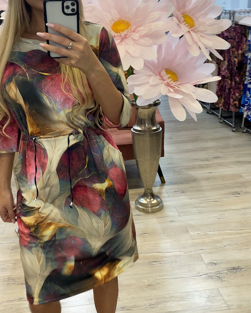 SPECIFICATIONS Style: Vintage Material: Cotton Blends Dress Type: Shift dress Dress Length: Knee Length Neckline: Round Neck Pattern Type: Gradient,Color Block Sleeve Type: Regular sleeve Sleeve Length: 3/4 Sleeve Details: Drawstring Fit Type: Regular Season: Spring,Summer Occasion: Daily Package Includes: 1 x Dress SIZE TABLE Size B...