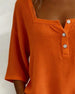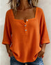 SPECIFICATIONS Top Type: Tops Style: Casual Material: Cotton Blends Occasion: Daily Neckline: Square Neck Pattern Type: Solid Color Sleeve Type: Regular sleeve Sleeve Length: 3/4 Sleeve Fit Type: Regular Season: Spring,Summer Details: Buttons Package Includes: 1 x Top SIZE TABLE Size Bust Length CM INCH CM INCH S 97 38.19 65 25....