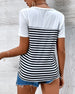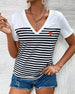 SPECIFICATIONS Top Type: T-shirt Style: Casual Material: Cotton Blends Occasion: Daily Neckline: V neck_V Pattern Type: Striped,Color Block Sleeve Type: Regular sleeve Sleeve Length: Short Sleeve Fit Type: Regular Season: Spring,Summer Details: Buttons Package Includes: 1 x T-shirt SIZE TABLE Size Bust Length CM INCH CM INCH S 9...