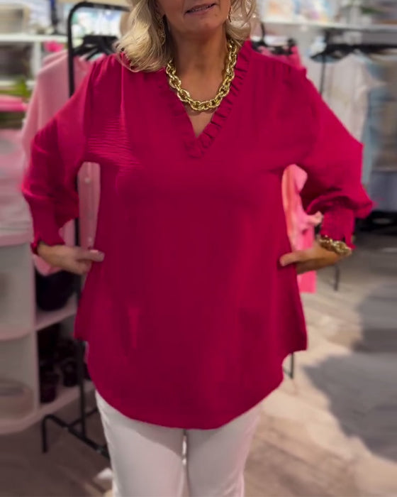 {"id":10016768295213,"title":"V-Neck Pullover Loose Casual Blouse","handle":"v-neck-pullover-loose-casual-blouse","description":"\u003ch4 data-mce-fragment=\"1\"\u003e\n\u003cspan data-mce-fragment=\"1\" style=\"color: #000000;\" data-mce-style=\"color: #000000;\"\u003eSPECIFICATIONS\u003c\/span\u003e\u003cbr data-mce-fragment=\"1\"\u003e\n\u003c\/h4\u003e\u003cul\u003e\n\u003cli data-mce-fragment=\"1\"\u003eTop Type: Blouses\u003c\/li\u003e\n\u003cli data-mce-fragment=\"1\"\u003eStyle: Casual\u003c\/li\u003e\n\u003cli data-mce-fragment=\"1\"\u003eMaterial: Cotton Blends\u003c\/li\u003e\n\u003cli data-mce-fragment=\"1\"\u003eOccasion: Daily\u003c\/li\u003e\n\u003cli data-mce-fragment=\"1\"\u003eNeckline: V neck_V\u003c\/li\u003e\n\u003cli data-mce-fragment=\"1\"\u003ePattern Type: Solid Color\u003c\/li\u003e\n\u003cli data-mce-fragment=\"1\"\u003eSleeve Type: Regular sleeve\u003c\/li\u003e\n\u003cli data-mce-fragment=\"1\"\u003eSleeve Length: Long Sleeve\u003c\/li\u003e\n\u003cli data-mce-fragment=\"1\"\u003eFit Type: Regular\u003c\/li\u003e\n\u003cli data-mce-fragment=\"1\"\u003eSeason: Spring,Summer\u003c\/li\u003e\n\u003cli data-mce-fragment=\"1\"\u003eDetails: Ruffle,Shirred\u003c\/li\u003e\n\u003cli data-mce-fragment=\"1\"\u003ePackage Includes: 1 x Blouse\u003c\/li\u003e\n\u003c\/ul\u003e\u003cbr\u003e\u003cul data-mce-fragment=\"1\"\u003e\u003c\/ul\u003e\u003ch4 data-mce-fragment=\"1\"\u003e\u003cspan data-mce-fragment=\"1\" style=\"color: #000000;\" data-mce-style=\"color: #000000;\"\u003eSIZE TABLE\u003c\/span\u003e\u003c\/h4\u003e\u003ctable style=\"width: 455px; height: 138px;\" border=\"0\" width=\"345\" cellspacing=\"0\" cellpadding=\"0\" data-sheets-root=\"1\" data-mce-fragment=\"1\"\u003e\n\u003ccolgroup\u003e\n\u003ccol style=\"width: 367.433px;\" span=\"5\" width=\"69\" data-mce-fragment=\"1\"\u003e \u003c\/colgroup\u003e\n\u003ctbody\u003e\n\u003ctr style=\"mso-height-source: userset; height: 18.0pt;\" data-mce-fragment=\"1\"\u003e\n\u003ctd class=\"xl65\" style=\"height: 32pt; width: 52pt; text-align: center;\" rowspan=\"2\" width=\"69\" height=\"43\" data-sheets-value='{\"1\":2,\"2\":\"Size\"}' data-mce-fragment=\"1\"\u003e\n\u003cstrong\u003e \u003c\/strong\u003e\n\u003cdiv data-mce-fragment=\"1\"\u003e\u003cstrong\u003eSize\u003c\/strong\u003e\u003c\/div\u003e\n\u003cstrong\u003e \u003c\/strong\u003e\n\u003c\/td\u003e\n\u003ctd class=\"xl65\" style=\"width: 104pt; text-align: center;\" colspan=\"2\" width=\"138\" data-sheets-value='{\"1\":2,\"2\":\"Bust\"}' data-mce-fragment=\"1\"\u003e\u003cstrong\u003eBust\u003c\/strong\u003e\u003c\/td\u003e\n\u003ctd class=\"xl65\" style=\"width: 104pt; text-align: center;\" colspan=\"2\" width=\"138\" data-sheets-value='{\"1\":2,\"2\":\"Length\"}' data-mce-fragment=\"1\"\u003e\u003cstrong\u003eLength\u003c\/strong\u003e\u003c\/td\u003e\n\u003c\/tr\u003e\n\u003ctr style=\"height: 14.0pt;\"\u003e\n\u003ctd class=\"xl65\" style=\"height: 14pt; text-align: center;\" height=\"19\"\u003e\u003cstrong\u003eCM\u003c\/strong\u003e\u003c\/td\u003e\n\u003ctd class=\"xl65\" style=\"text-align: center;\" data-sheets-value='{\"1\":2,\"2\":\"INCH\"}' data-mce-fragment=\"1\"\u003e\u003cstrong\u003eINCH\u003c\/strong\u003e\u003c\/td\u003e\n\u003ctd class=\"xl65\" style=\"text-align: center;\" data-sheets-value='{\"1\":2,\"2\":\"CM\"}' data-mce-fragment=\"1\"\u003e\u003cstrong\u003eCM\u003c\/strong\u003e\u003c\/td\u003e\n\u003ctd class=\"xl65\" style=\"text-align: center;\" data-sheets-value='{\"1\":2,\"2\":\"INCH\"}' data-mce-fragment=\"1\"\u003e\u003cstrong\u003eINCH\u003c\/strong\u003e\u003c\/td\u003e\n\u003c\/tr\u003e\n\u003ctr style=\"text-align: center;\" data-mce-fragment=\"1\"\u003e\n\u003ctd class=\"xl65\" style=\"height: 14pt; text-align: center;\" height=\"19\" data-sheets-value='{\"1\":2,\"2\":\"S\"}' data-mce-fragment=\"1\"\u003eS\u003c\/td\u003e\n\u003ctd class=\"xl65\" style=\"text-align: center;\"\u003e97\u003c\/td\u003e\n\u003ctd class=\"xl65\" style=\"text-align: center;\"\u003e38.19\u003c\/td\u003e\n\u003ctd class=\"xl65\" style=\"text-align: center;\" data-sheets-value='{\"1\":3,\"3\":65}' data-mce-fragment=\"1\"\u003e65\u003c\/td\u003e\n\u003ctd class=\"xl65\" style=\"text-align: center;\" data-sheets-value='{\"1\":3,\"3\":25.590551181102363}' data-sheets-numberformat='{\"1\":2,\"2\":\"0.00\",\"3\":1}' data-sheets-formula=\"=R[0]C[-1]\/2.54\" data-mce-fragment=\"1\"\u003e25.59\u003c\/td\u003e\n\u003c\/tr\u003e\n\u003ctr style=\"text-align: center;\" data-mce-fragment=\"1\"\u003e\n\u003ctd class=\"xl65\" style=\"height: 14pt; text-align: center;\" height=\"19\" data-sheets-value='{\"1\":2,\"2\":\"M\"}' data-mce-fragment=\"1\"\u003eM\u003c\/td\u003e\n\u003ctd class=\"xl65\" style=\"text-align: center;\"\u003e101\u003c\/td\u003e\n\u003ctd class=\"xl65\" style=\"text-align: center;\"\u003e39.76\u003c\/td\u003e\n\u003ctd class=\"xl65\" style=\"text-align: center;\" data-sheets-value='{\"1\":3,\"3\":66.5}' data-mce-fragment=\"1\"\u003e66.5\u003c\/td\u003e\n\u003ctd class=\"xl65\" style=\"text-align: center;\" data-sheets-value='{\"1\":3,\"3\":26.181102362204722}' data-sheets-numberformat='{\"1\":2,\"2\":\"0.00\",\"3\":1}' data-sheets-formula=\"=R[0]C[-1]\/2.54\" data-mce-fragment=\"1\"\u003e26.18\u003c\/td\u003e\n\u003c\/tr\u003e\n\u003ctr style=\"text-align: center;\" data-mce-fragment=\"1\"\u003e\n\u003ctd class=\"xl65\" style=\"height: 14pt; text-align: center;\" height=\"19\" data-sheets-value='{\"1\":2,\"2\":\"L\"}' data-mce-fragment=\"1\"\u003eL\u003c\/td\u003e\n\u003ctd class=\"xl65\" style=\"text-align: center;\" data-sheets-value='{\"1\":3,\"3\":105}' data-mce-fragment=\"1\"\u003e105\u003c\/td\u003e\n\u003ctd class=\"xl65\" style=\"text-align: center;\" data-sheets-value='{\"1\":3,\"3\":41.338582677165356}' data-sheets-numberformat='{\"1\":2,\"2\":\"0.00\",\"3\":1}' data-sheets-formula=\"=R[0]C[-1]\/2.54\" data-mce-fragment=\"1\"\u003e41.34\u003c\/td\u003e\n\u003ctd class=\"xl65\" style=\"text-align: center;\" data-sheets-v