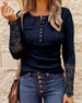 SPECIFICATIONS Top Type: Tops Style: Elegant Material: 95% Polyester, 5% Spandex Occasion: Daily Neckline: Round Neck Pattern Type: Solid Color Sleeve Type: Regular sleeve Sleeve Length: Long Sleeve Fit Type: Regular Season: Spring,Fall Details: Buttons,Lace Package Includes: 1 x Top SIZE TABLE Size Bust Length Sleeves Shoulder ...