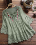 SPECIFICATIONS Top Type: Blouses Style: Casual Material: Cotton Blends,Lace Occasion: Daily Neckline: Round Neck Pattern Type: Floral,Solid Color Sleeve Type: Regular sleeve Sleeve Length: 3/4 Sleeve Fit Type: Regular Season: Summer Details: Lace Up,Hollow Out,Lace Package Includes: 1 x Blouse SIZE TABLE Size Bust Length CM INCH CM INCH...
