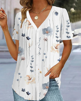 SPECIFICATIONS Top Type: Blouses Style: Casual Material: Cotton Blends Occasion: Daily Neckline: V neck_V Pattern Type: Print Sleeve Type: Regular sleeve Sleeve Length: Short Sleeve Fit Type: Regular Season: Spring, Summer, Fall Details: Buttons Package Includes: 1 x Blouse SIZE TABLE Size Bust Length CM INCH CM INCH S 95 3...