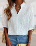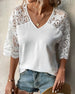 SPECIFICATIONS Top Type: Blouses Style: Casual Material: Cotton Blends, Lace Occasion: Daily Neckline: V neck_V Pattern Type: Solid Color Sleeve Type: Puff Sleeve Sleeve Length: 3/4 Sleeve Fit Type: Regular Season: Spring, Summer, Fall Details: Patchwork, Hollow Out Package Includes: 1 x Blouse SIZE TABLE Size Bust Length Sle...