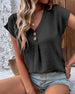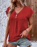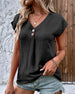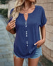 SPECIFICATIONS Top Type: T-shirt Style: Casual Material: Cotton Blends Occasion: Daily Neckline: V neck_V Pattern Type: Solid Color Sleeve Type: Regular sleeve Sleeve Length: Short Sleeve Fit Type: Regular Season: Spring, Summer, Fall Details: Buttons, Shirred Package Includes: 1 x T-shirt SIZE TABLE (cm) Size Bust Length cm ...