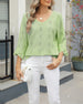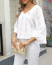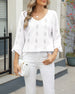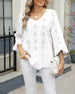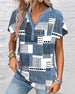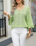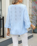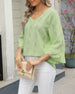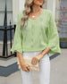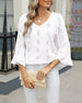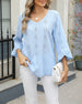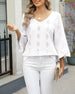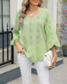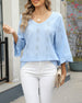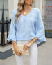 SPECIFICATIONS Top Type: Tops Style: Casual Material: Cotton Blends Occasion: Daily Neckline: V neck_V Pattern Type: Geometric Print Sleeve Type: Flare Sleeve Sleeve Length: Nine Points Sleeve Fit Type: Regular Season: Spring,Summer Details: Hollow Out Package Includes: 1 x Top SIZE TABLE Size Bust Sleeves Shoulder Length CM INCH CM I...