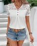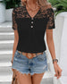 SPECIFICATIONS Top Type: Blouses Style: Casual Material: Spandex,Polyester Occasion: Daily Neckline: V neck_V Pattern Type: Solid Color Sleeve Type: Regular sleeve Sleeve Length: Short Sleeve Fit Type: Regular Season: Spring,Summer Details: Patchwork,Buttons,Lace Package Includes: 1 x Blouse SIZE TABLE Size Bust Length CM INCH CM INCH...