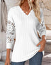 SPECIFICATIONS Top Type: Tops Style: Casual Material: A: 95% Cotton 5% Spandex; B: 100% Polyester Occasion: Daily Neckline: V neck_V Pattern Type: Solid Color Sleeve Type: Dropped shoulder Sleeve Length: Long Sleeve Fit Type: Regular Season: Fall,Winter Details: Patchwork,Hollow Out,Lace Package Includes: 1 x Top SIZE TABLE Size ...