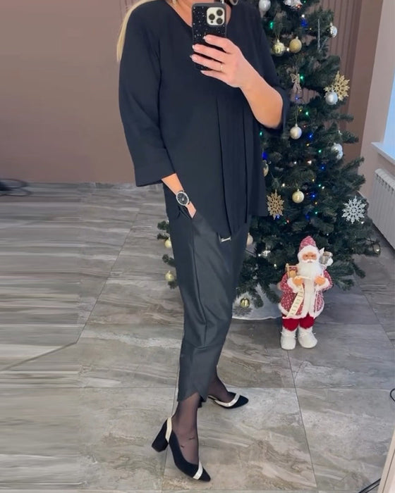 Lapel Three-Quarter Sleeve Contrast Color Blouse
